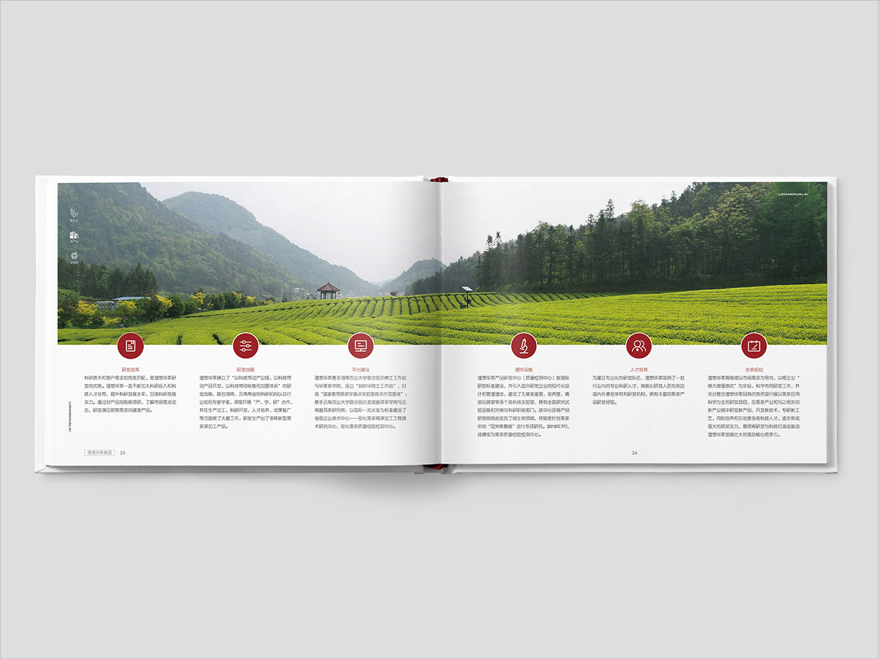 理想華萊科技集團公司畫冊設計的封面采用了精裝鏤空卡套的形式,這種設計不僅提升了畫冊的整體質(zhì)感,還通過鏤空的部分巧妙地展示了內(nèi)部內(nèi)容的精髓。封面的主色調(diào)以深紅色為主,象征著黑茶的深厚歷史和文化底蘊,同時通過品牌logo燙金的工藝,突顯品牌的高端定位和科技感,整本畫冊圍繞茶文化、茶產(chǎn)業(yè)、茶科技的融合進行內(nèi)容的布局,既保留了傳統(tǒng)茶文化的韻味,又融入了現(xiàn)代科技的元素。通過精美的視覺呈現(xiàn)和詳實的內(nèi)容,畫冊不僅傳達了理想華萊的品牌價值,還為讀者提供了一次深入了解黑茶產(chǎn)業(yè)的機會。通過精心的設計和內(nèi)容編排,理想華萊科技集團公司畫冊設計成功地將茶文化、茶產(chǎn)業(yè)和茶科技融為一體,為讀者帶來了一場視覺和思想的盛宴。